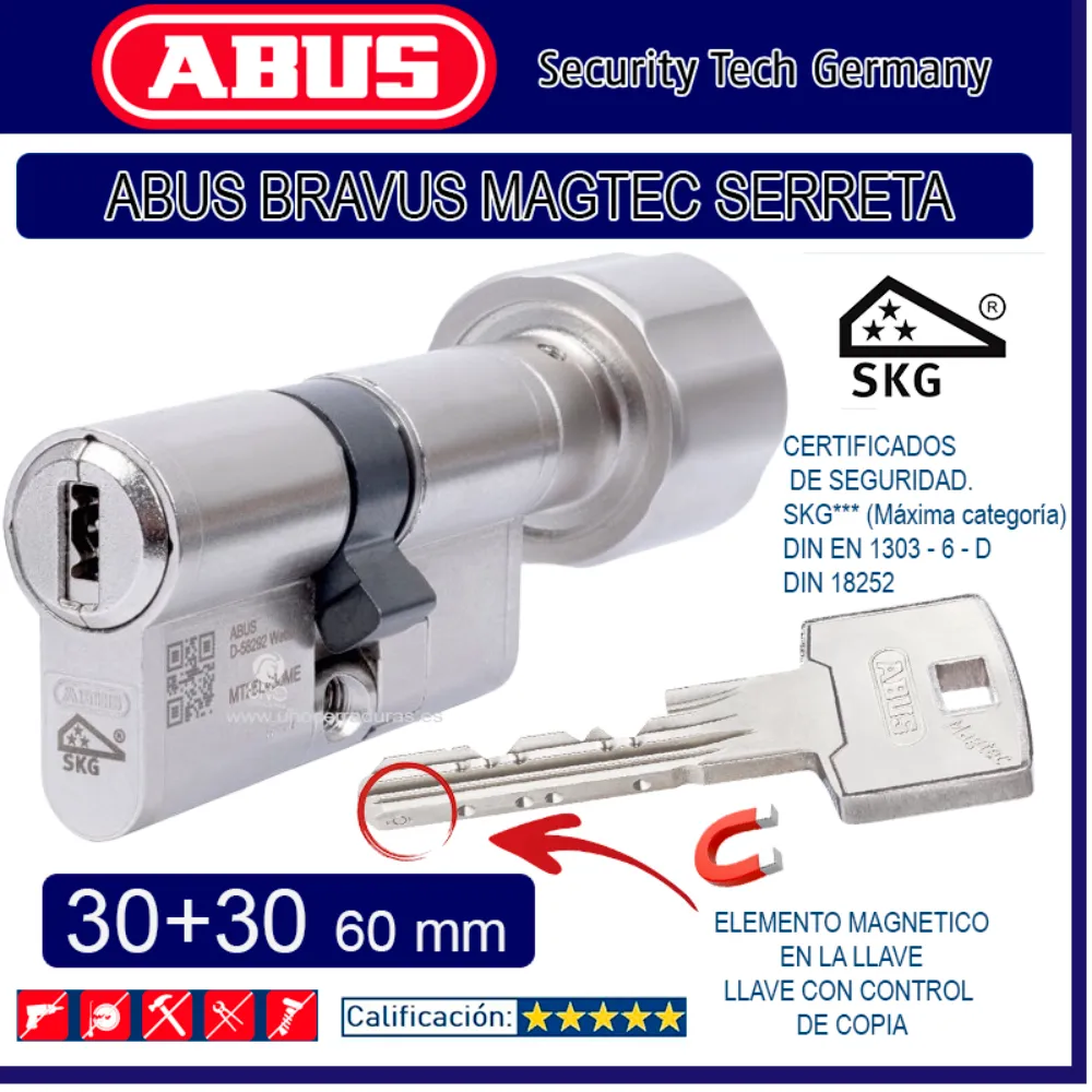 CILINDRO ABUS BRAVUS MAGTEC SERRETA 30+30 CON POMO MAGNETICO CROMO