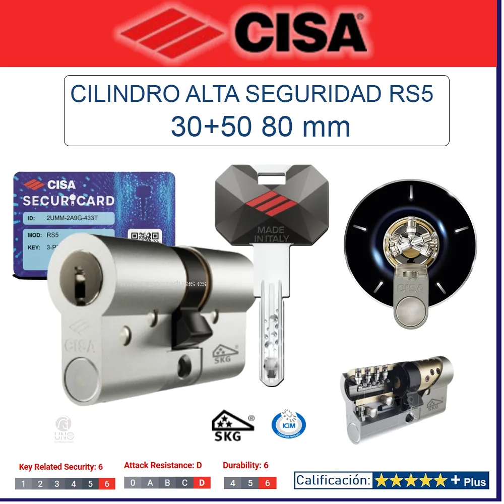 Cilindro CISA RS5, bombín alta seguridad, cilindro perfil europeo, cerradura CISA, sistema SECURiCARD, llave incopiable digital, cilindro antibumping.