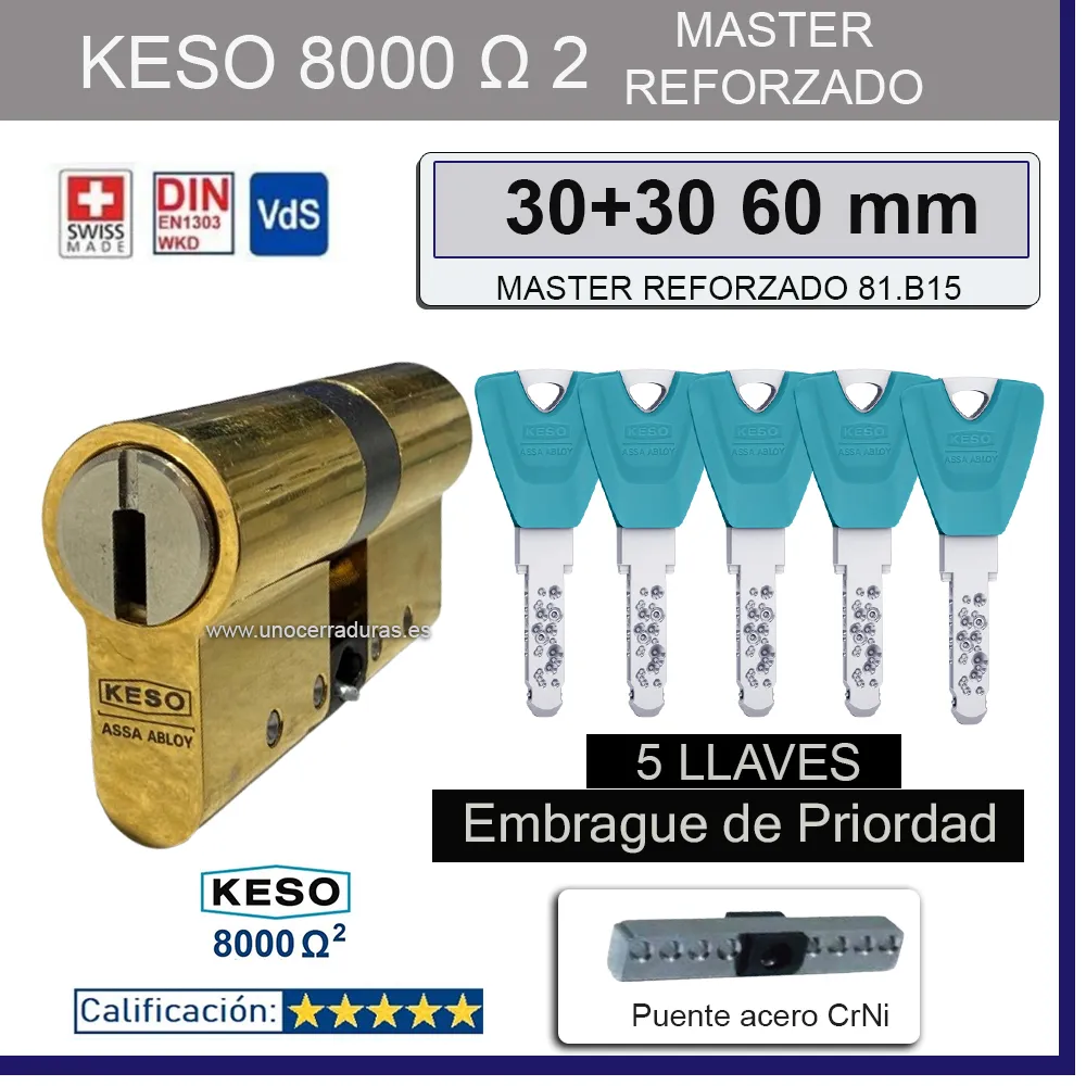 CILINDRO KESO 8000 Omega² 81.B15 MASTER REFORZADO 30+30:60mm ORO 5 Llaves EMBRAGUE DE PRIORIDAD