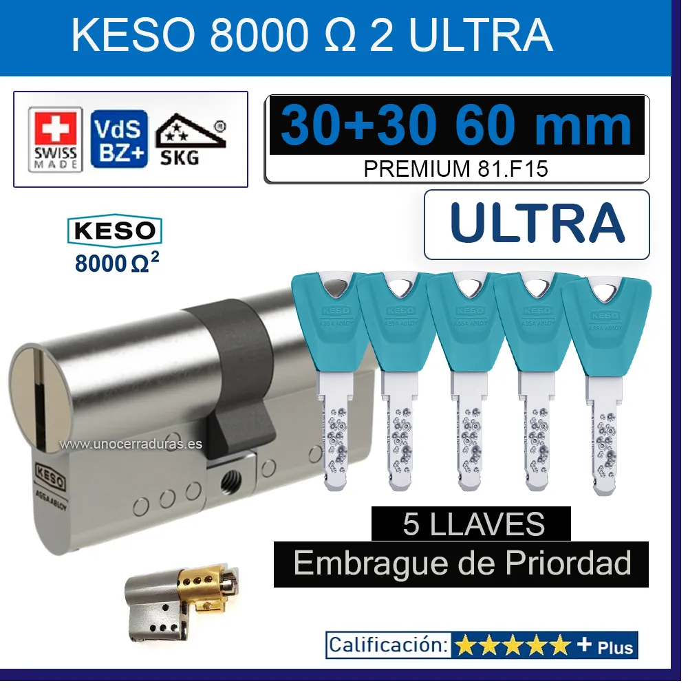 CILINDRO KESO 8000 Omega² 81.F15 ULTRA 30+30:60mm 5 Llaves EMBRAGUE DE PRIORIDAD