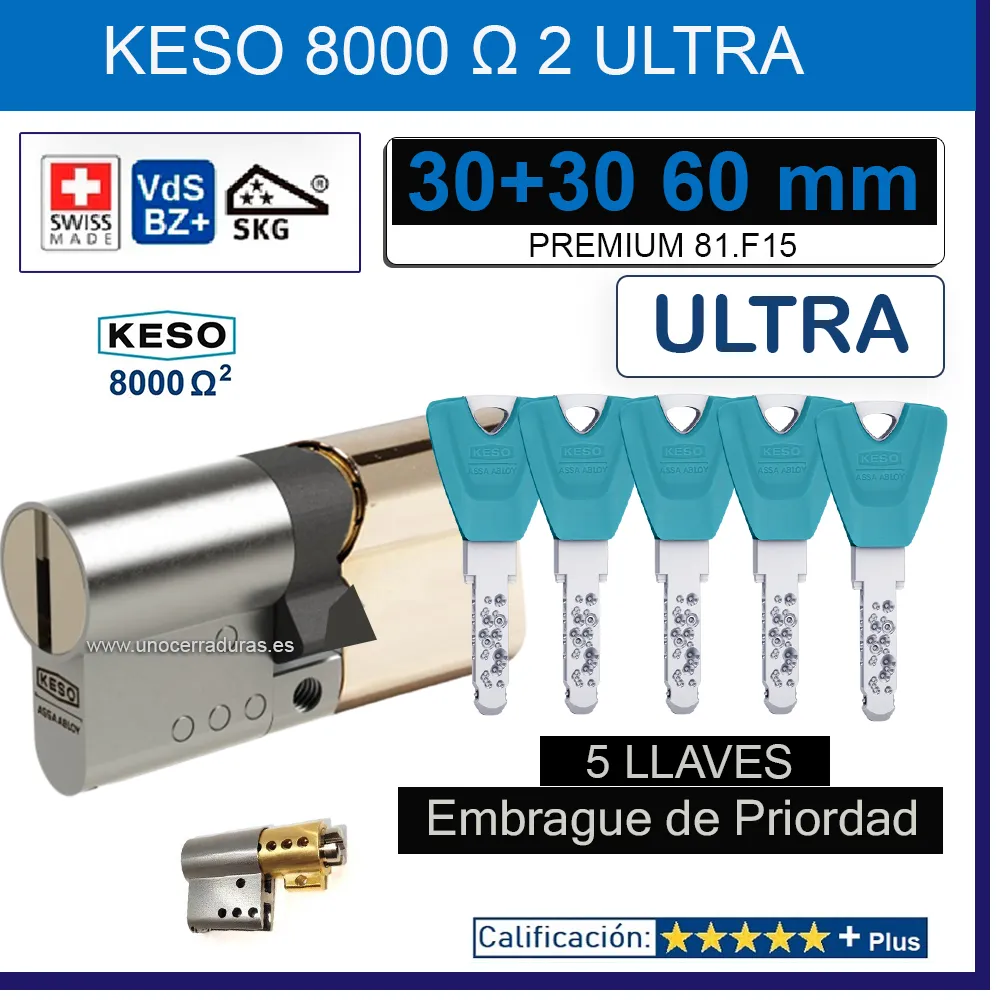 CILINDRO KESO 8000 Omega² 81.F15 ULTRA 30+30:60mm 5 Llaves ORO EMBRAGUE DE PRIORIDAD